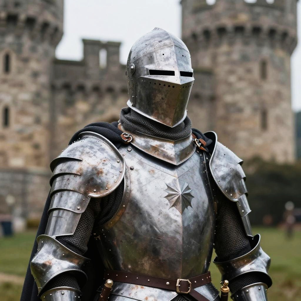Realistic photo.Close-up portrait of a noble knight with shining armor, battle scars, flowing cape, castle battlement background, sharp and intense details. realistic photo