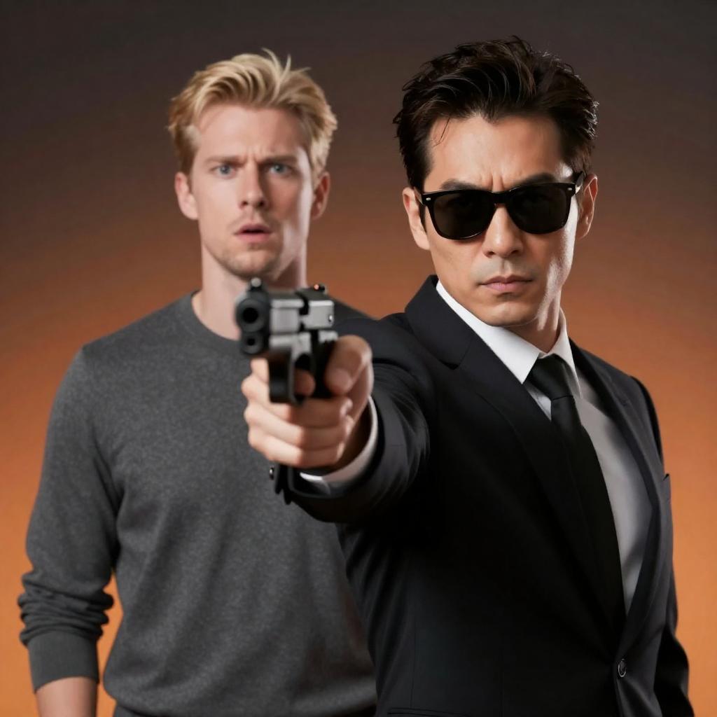 Photograph of four middle-aged men with intense expressions. One man in foreground profile, blonde hair, sunglasses. Two men in black suits walking left, holding hands. Fourth man in background, dark hair, sunglasses, white shirt. Black convertible car between two suited men. White background.