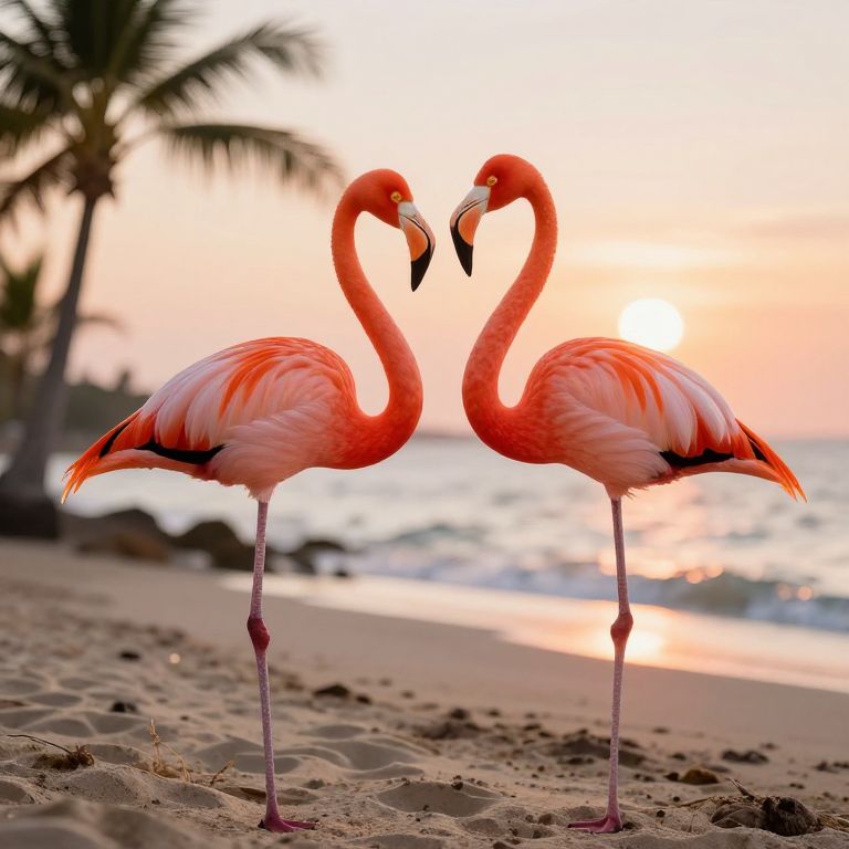 Vibrant Flamingos at Sunset Beach