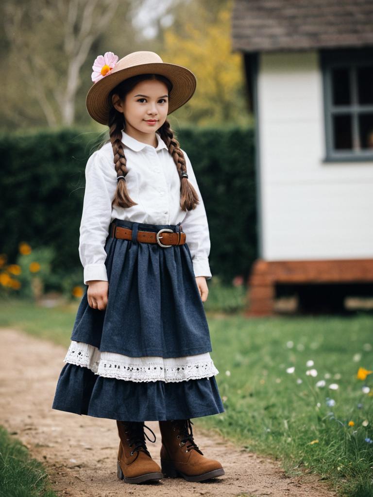 Gabbys dollhouse costume, solo, hat, 1girl, brown hair, flower, long skirt, outdoors, belt, standing, white shirt, shirt, full body, boots, skirt, hat flower, braid, day, long sleeves, blurry background, long hair, blurry