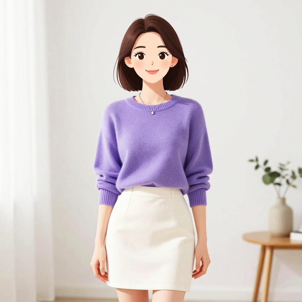 Woman with pretty face and pretty hair. smiling Woman, minimalist chic, powder blue mohair sweater with a crew neck and gathered long sleeves, short white textured skirt, simple silver necklace, light and airy studio background with a soft-focus white backdrop. --sref 1467