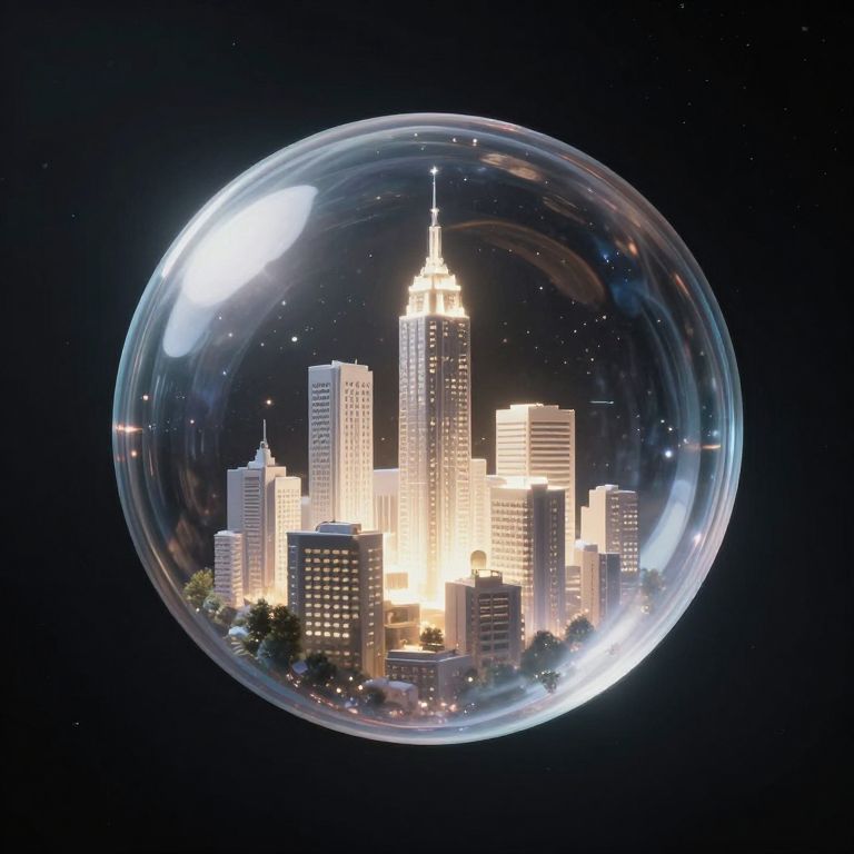 Photorealistic digital artwork of a glowing cityscape inside a transparent glass bubble, set against a starry black night sky.