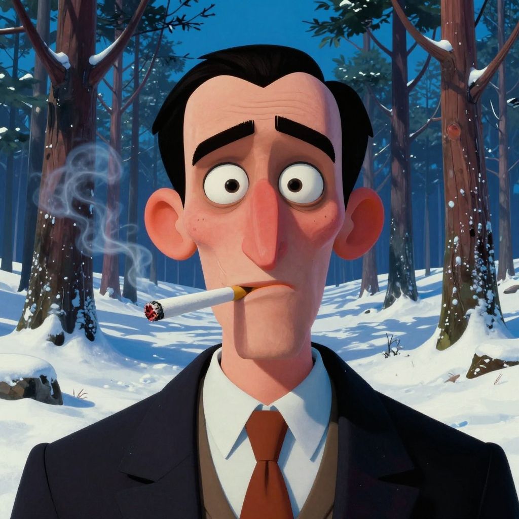 (Style: realism, (epic:1.2), realistic, photo, trending on artstation, (pixar), 3d, ((high quality:1.2, masterpiece:1.2)), (8k resolution), high details, incredibly absurdres, color connection, colorized, colorful), stylized by Lois van Baarle, David Palumbo and Herb Lubalin, close up of a Refined (Guy:1.3), very evil, Cigarette, forest, Winter, Very wide view, Masterpiece, Methaphysical painting, Cinematic, Fujicolor Fujichrome Velvia 100, 35mm, crisp lines, cinema