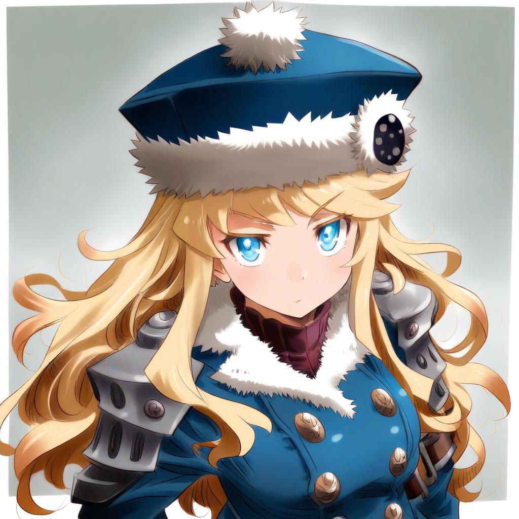 Illustration of an anime girl with long blonde hair and blue eyes wearing a blue military-style coat with fur trim and metallic shoulder armor. She has a matching blue hat adorned with white fur and a pom-pom, exuding a determined expression. The artwork features clean, vibrant colors and detailed shading typical of modern anime style.