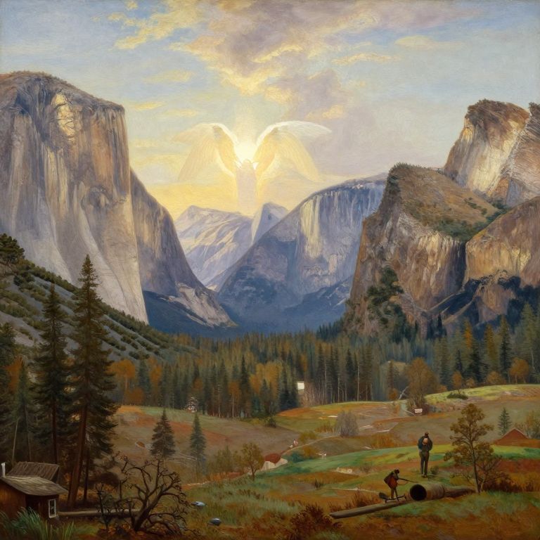 Photorealistic painting of Yosemite Valley at sunrise, featuring towering granite cliffs, a forested valley, a small house, and a person riding a horse