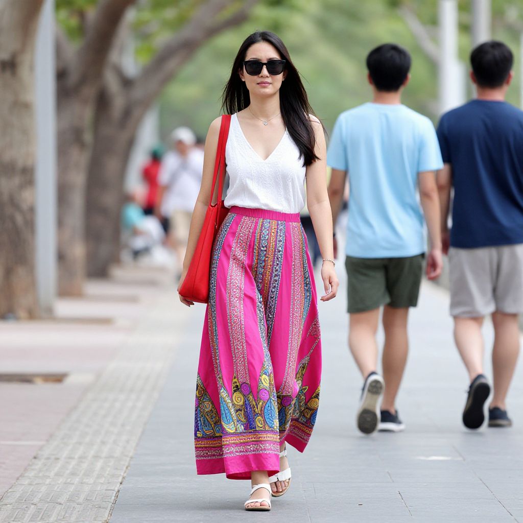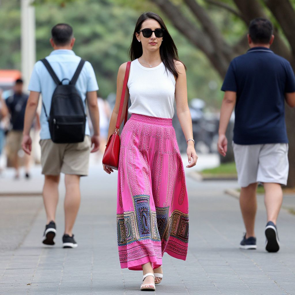Woman walking outdoors wearing a vibrant Ira Soleil pink block-printed long skirt paired with a white sleeveless top, accessorized with a red shoulder bag, sunglasses, and white sandals, while two pedestrians walk ahead on a tree-lined sidewalk.
