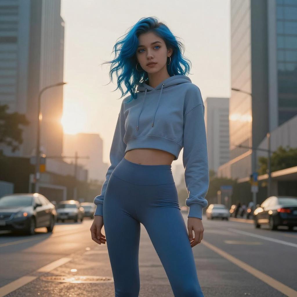 Samdoesarts style. Cinematic portrait, wide action shot. stunning, gorgeous teen, wavy blue hair, detailed alluring blue eyes. Thigh gap, long sexy legs. Leggings, tiny crop top hoodie. beautiful futuristic urban sunrise, bloom, crepuscular rays, photorealistic lighting