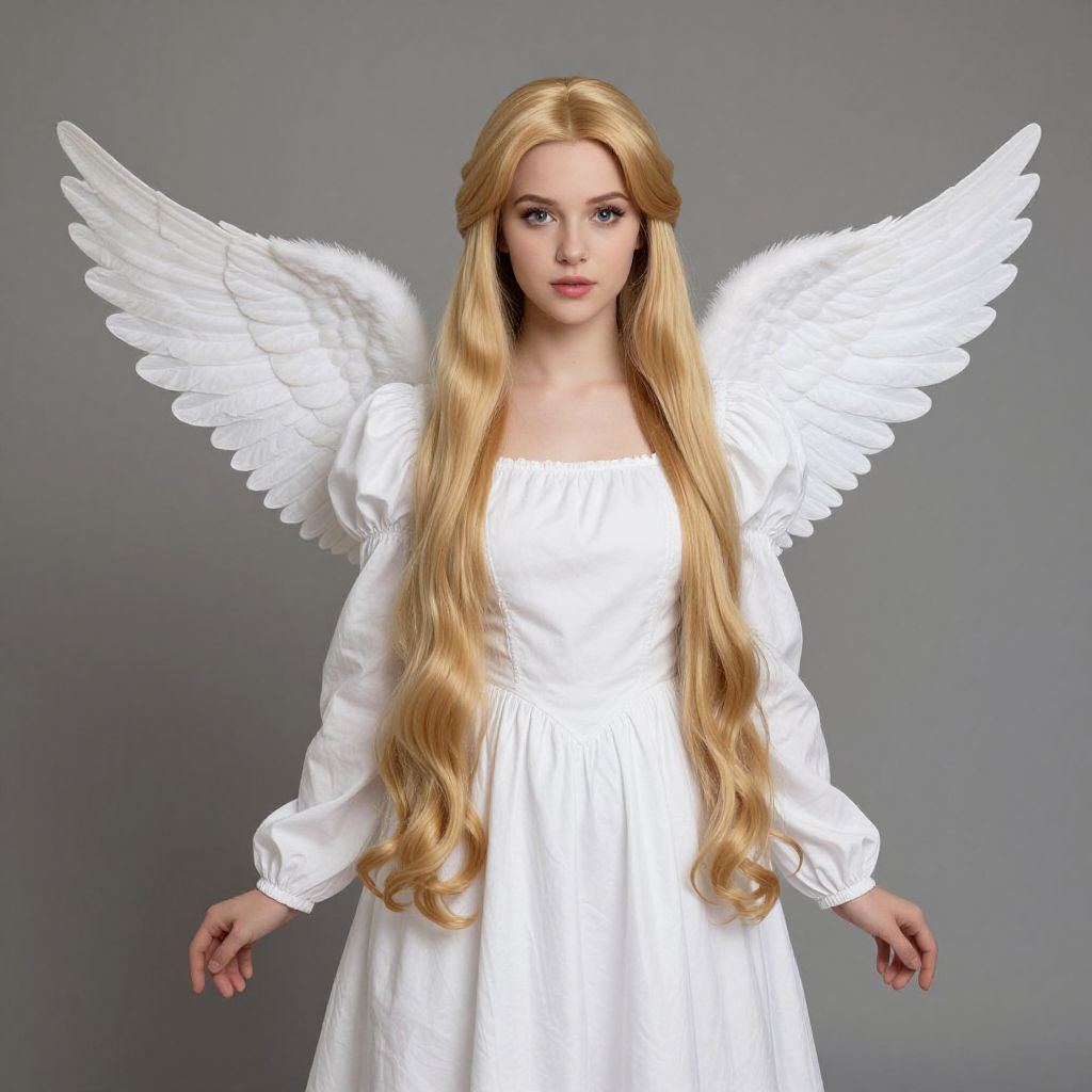 Angel secret rapunzel, 1girl, solo, wings, dress, long hair, long sleeves, puffy sleeves, simple background, fairy, drill hair, juliet sleeves, looking at viewer, breasts, blonde hair, white dress