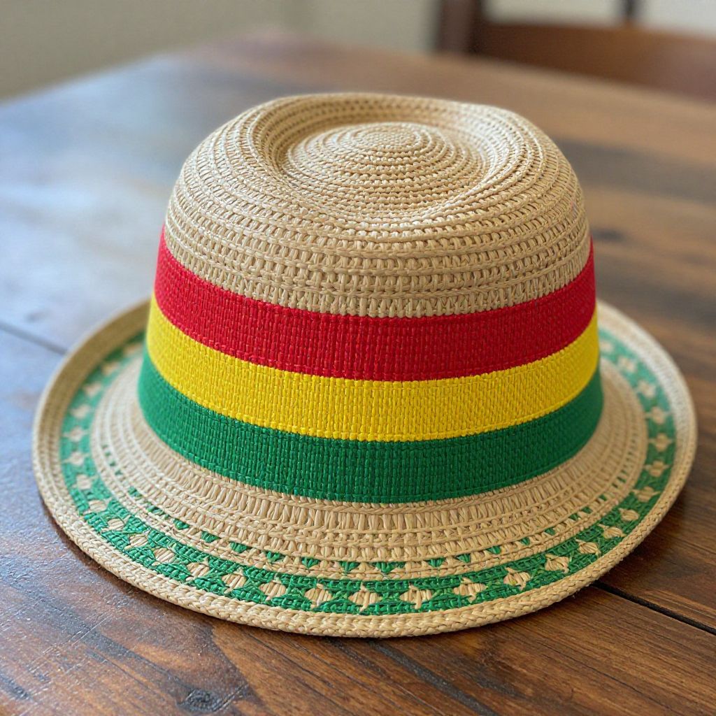 Close-up of a rastaman hat made of woven straw with red, yellow, and green stripes, rustic wooden table setting, soft natural light, intricate fabric detail