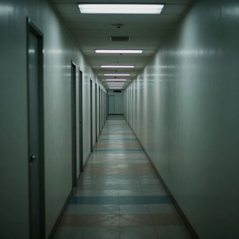 An endless corridor of mirrored reflections stretches toward infinity, its rhythmic repetition evoking a profound sense of isolation and introspection, while the soft hum of unseen machinery whispers the relentless march of time.