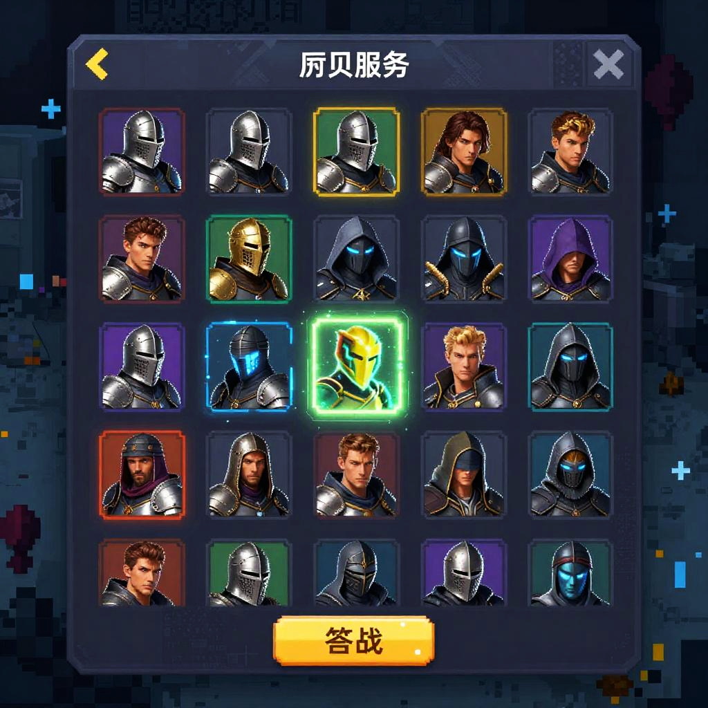 Random game character generator interface, displaying a variety of customizable avatars from medieval knights to cyberpunk hackers, detailed UI elements, holographic effects, immersive environment with floating selection menus and pixel art background.