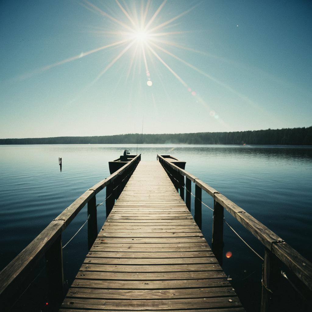 Wide-angle view of a wooden fishing dock extending into a calm lake at sunrise. The early morning sun creates a lens flare and long shadows on the dock's planks. Dense forest lines the horizon under a clear sky, evoking stillness and anticipation.