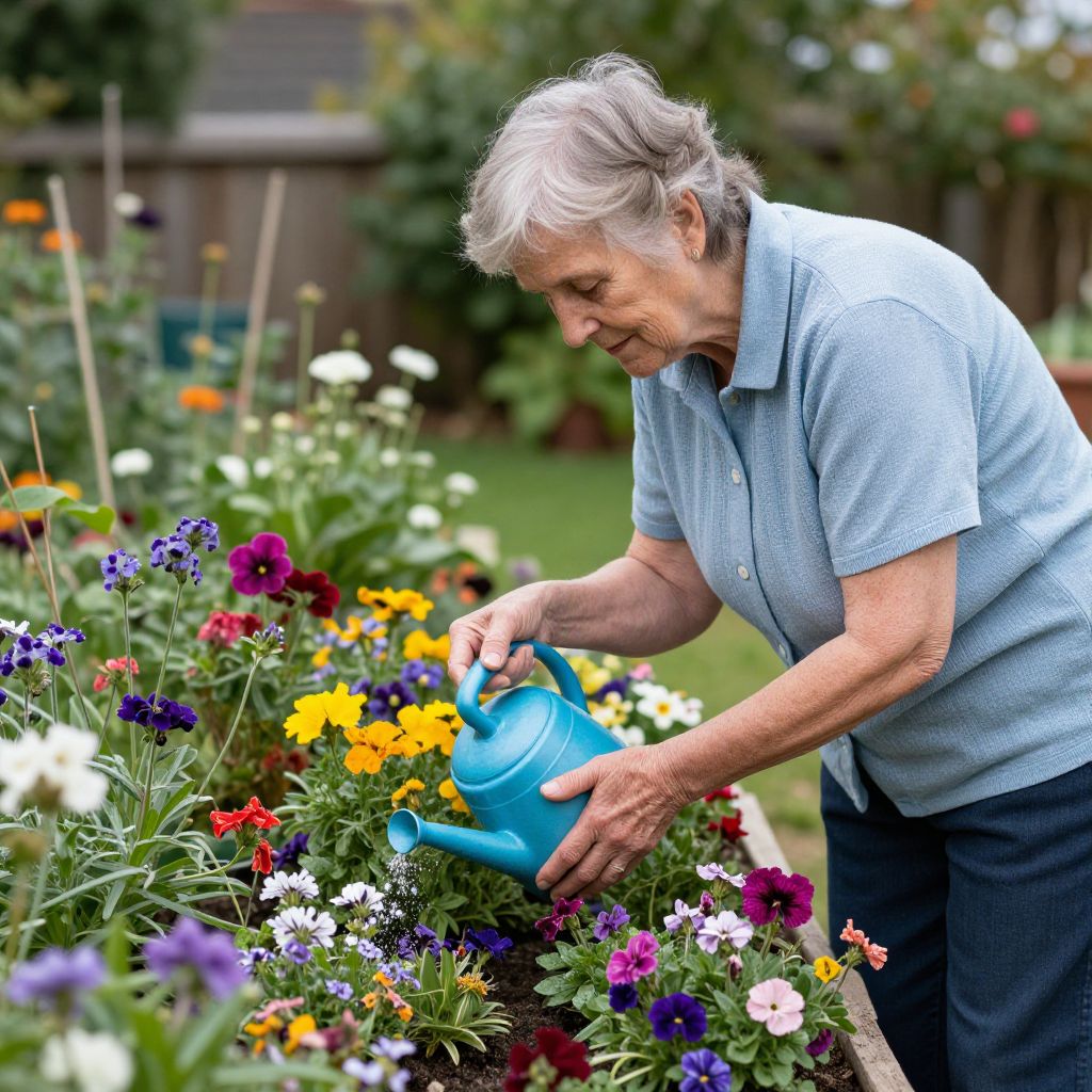 Elderly woman with short gray hair, wearing a light blue polo shirt, watering vibrant flower garden with a blue watering can.