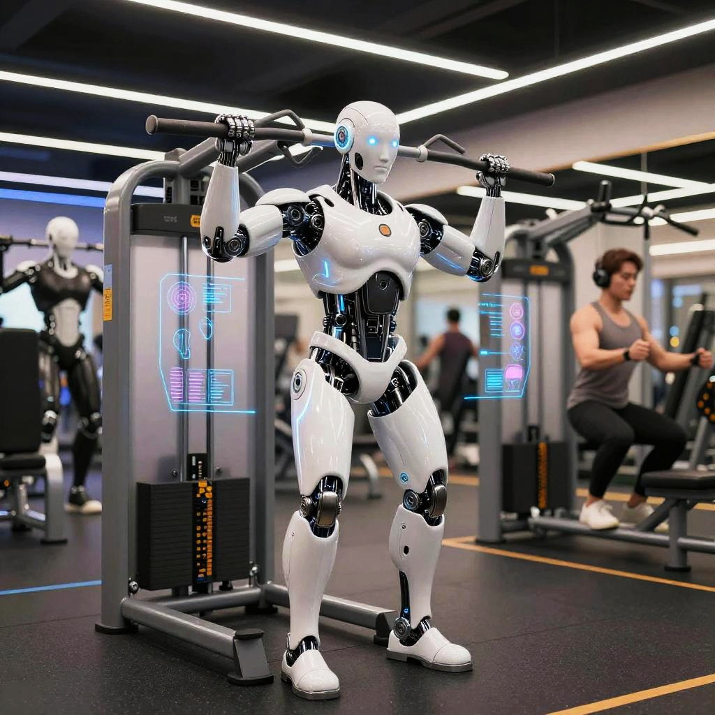 AI bodybuilding gym interior, advanced android lifters using smart machines, sleek designs mixing human muscle shapes and robotic materials, pulsating lights and augmented reality interfaces, hyper-detailed mechanical muscles, futuristic and energetic atmosphere