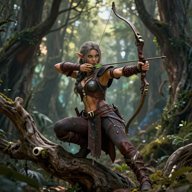 A digital fantasy artwork depicts a gray-haired, elf-like woman with pointed ears and green eyes, drawing a bow on a moss-covered, fallen tree in a dense, sunlit forest. She wears a leather armor set with metal plates, dark pants, and brown boots, her right knee bent on the tree branch. Her focused expression and outstretched arm emphasize her archery skill. The background shows tall trees with dappled sunlight filtering through the leaves, creating a mystical atmosphere. Her bow is wooden with a dark, polished finish. The image combines realistic textures with a fantasy style, highlighting her warrior appearance.
