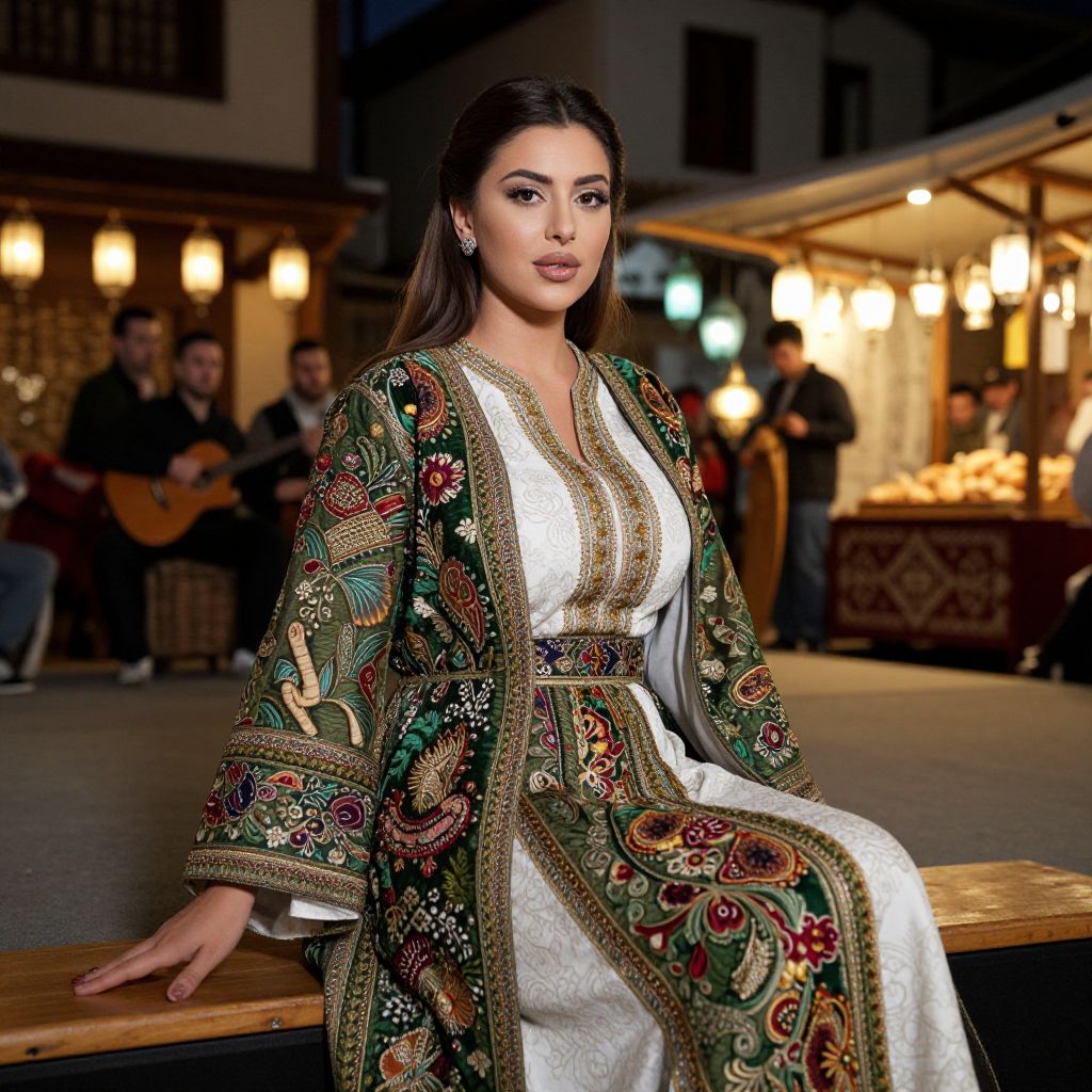 A bold and elegant woman with deep brown eyes and a soft olive complexion wearing a full traditional Turkish national costume, including a patterned green and white tunic, a wide-sleeved vest, and a long, embroidered skirt, sitting on a wooden bench at a folk music performance in a historic Turkish marketplace, with lanterns and market stalls illuminated in the night.. The woman has big breasts and cute face