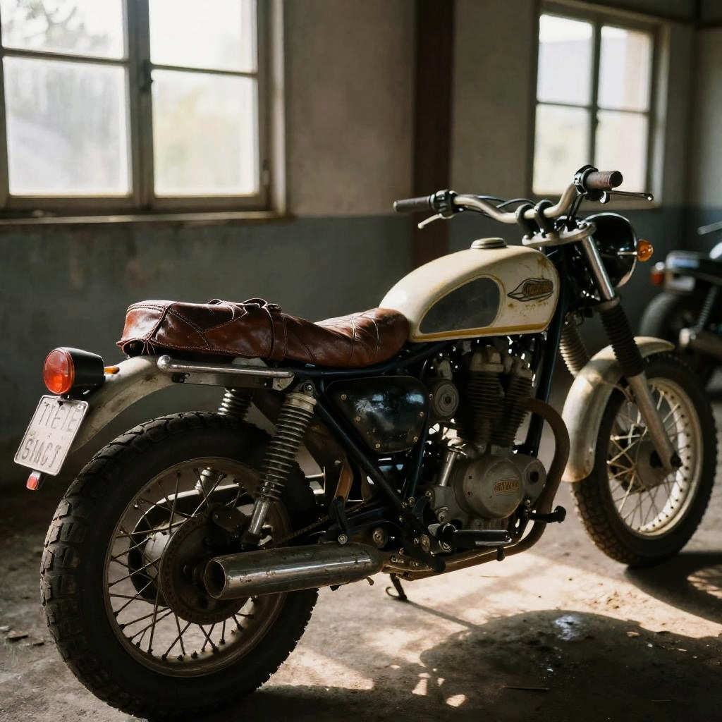 Leathers draped over vintage motorcycles in an abandoned garage, soft sunbeams filtering through dusty windows, emphasizing worn textures, faded colors, and an overall nostalgic, rebellious vibe.