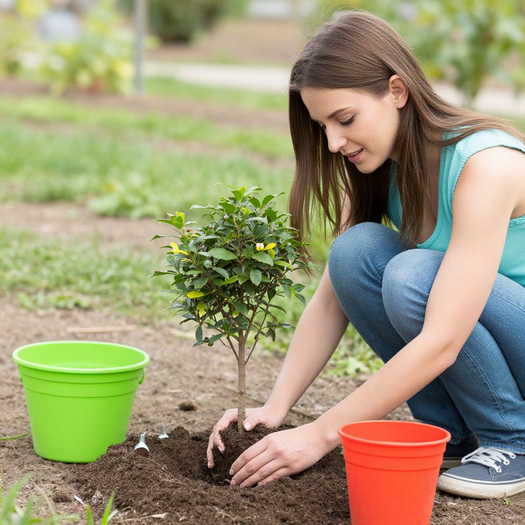 Photograph of a young Caucasian woman with straight, shoulder-length brown hair, wearing a light blue T-shirt and blue jeans, crouching in a garden. She is planting a small, leafy green tree in dark soil, using her right hand. Two plastic buckets, one red and one green, are on the ground to her left and right. The background is blurred, featuring green foliage and a hint of colorful flowers. The woman is focused and smiling slightly, creating a serene and productive gardening scene.