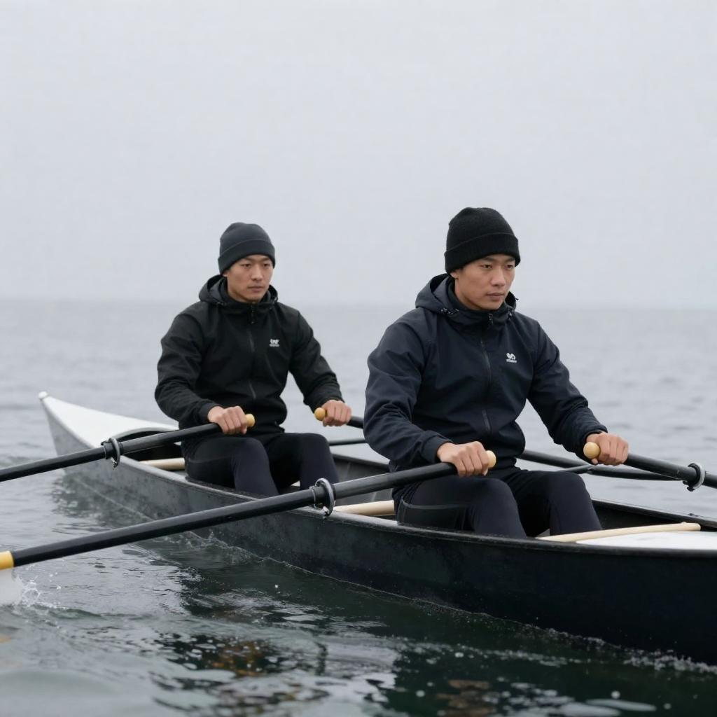 Two men in a blue and orange oval-shaped racing car with a white front guard. One man is driving, smiling, while the other is in the passenger seat, smiling. They drive on a tree-lined street. Spectators sit on a bench in the background. Greenery and parked cars are visible.