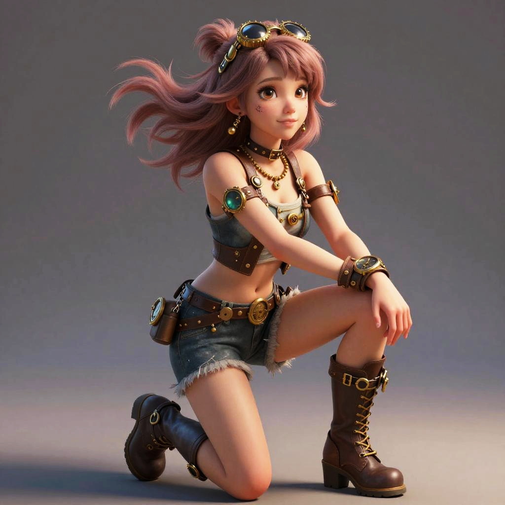 Realistic, hyperrealistic, rim lighting, global illumination, dramatic lighting, (masterpiece), (best_quality), (ultra-detailed), (illustration), (contrapposto:1.3), (full body:1.4), 8k, absurdres, vivid colors, pastel brown hair, spunky Steampunk girl