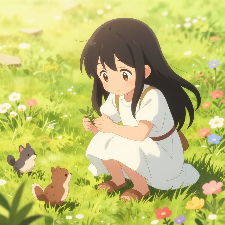Anime loli girl playing with small woodland creatures in a sunlit meadow, colorful flowers around, soft and warm lighting, detailed anime illustration, endearing expression