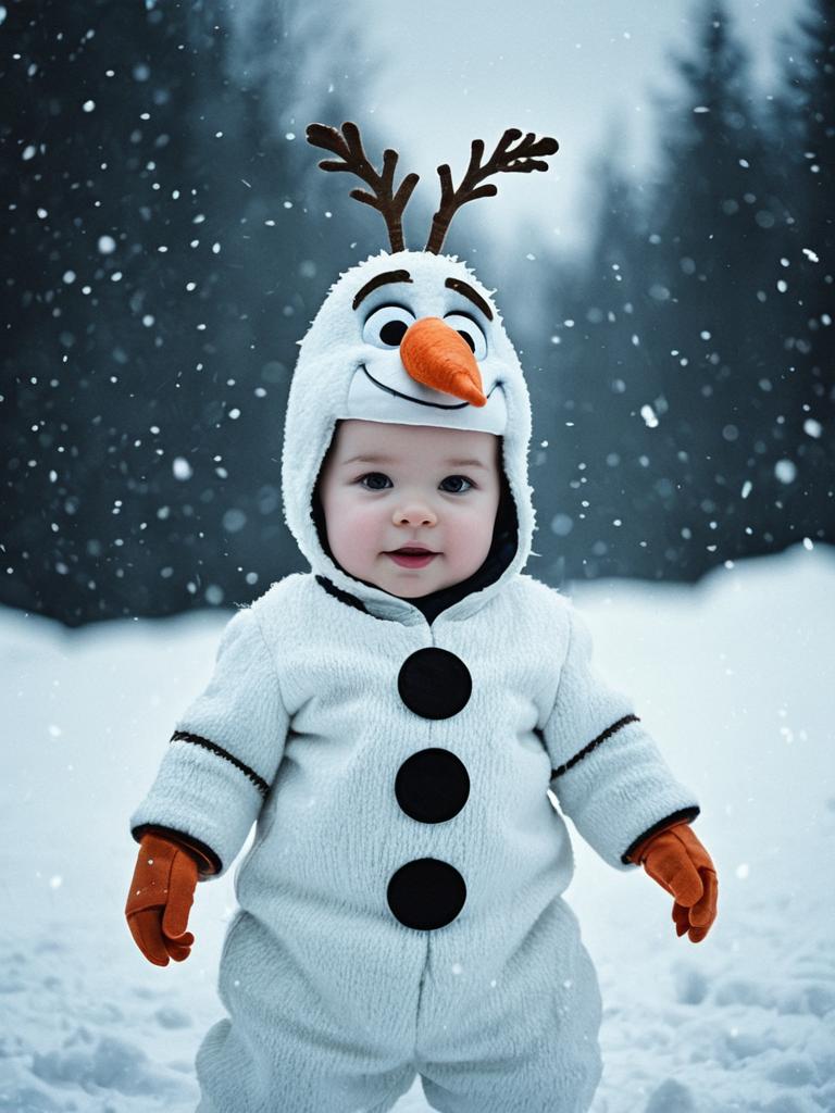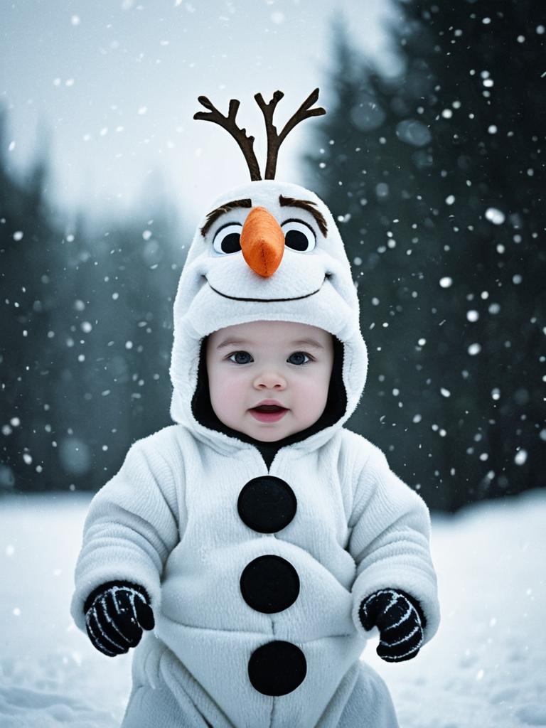 Infant in Olaf Costume, cinematic realism, adorable snowy baby portrait