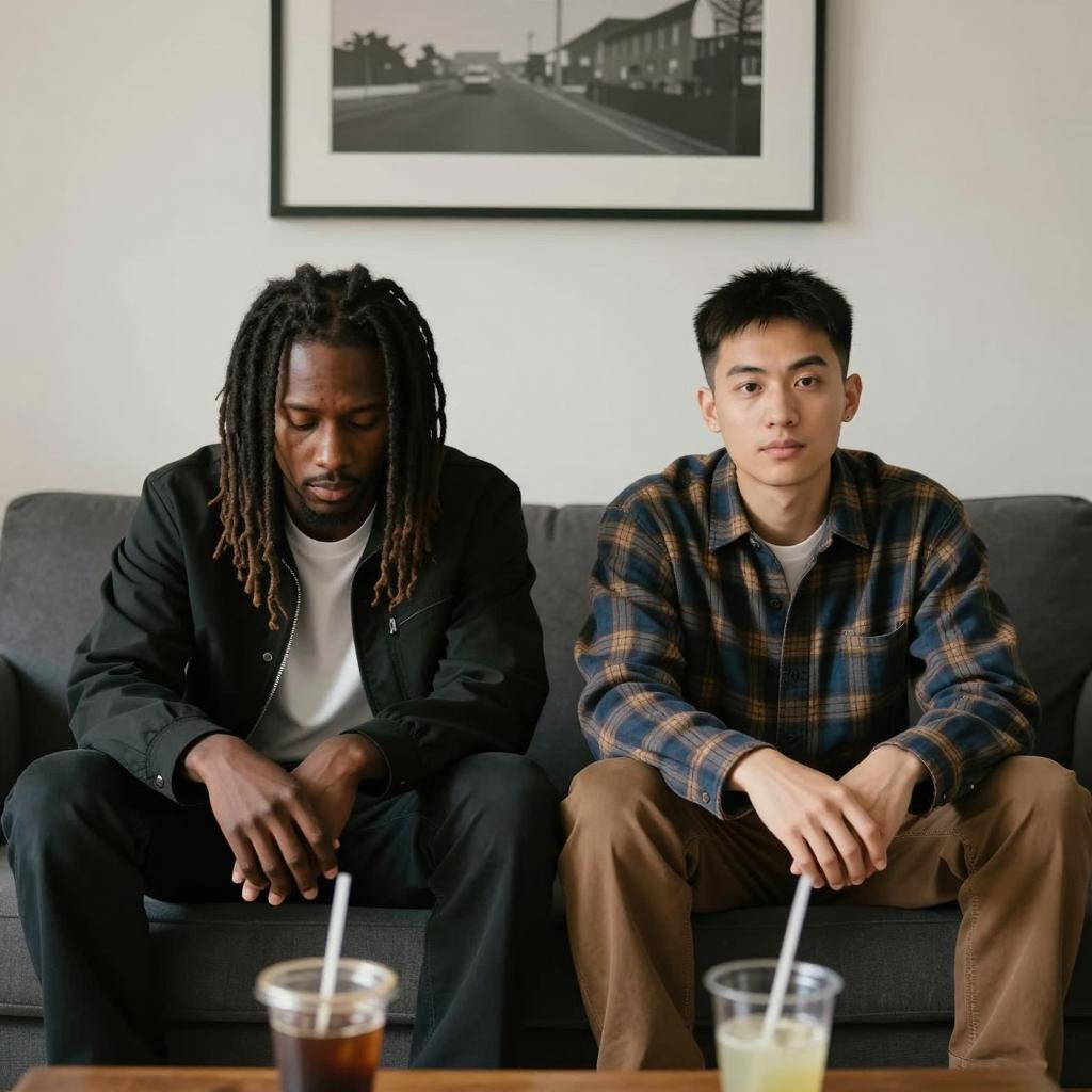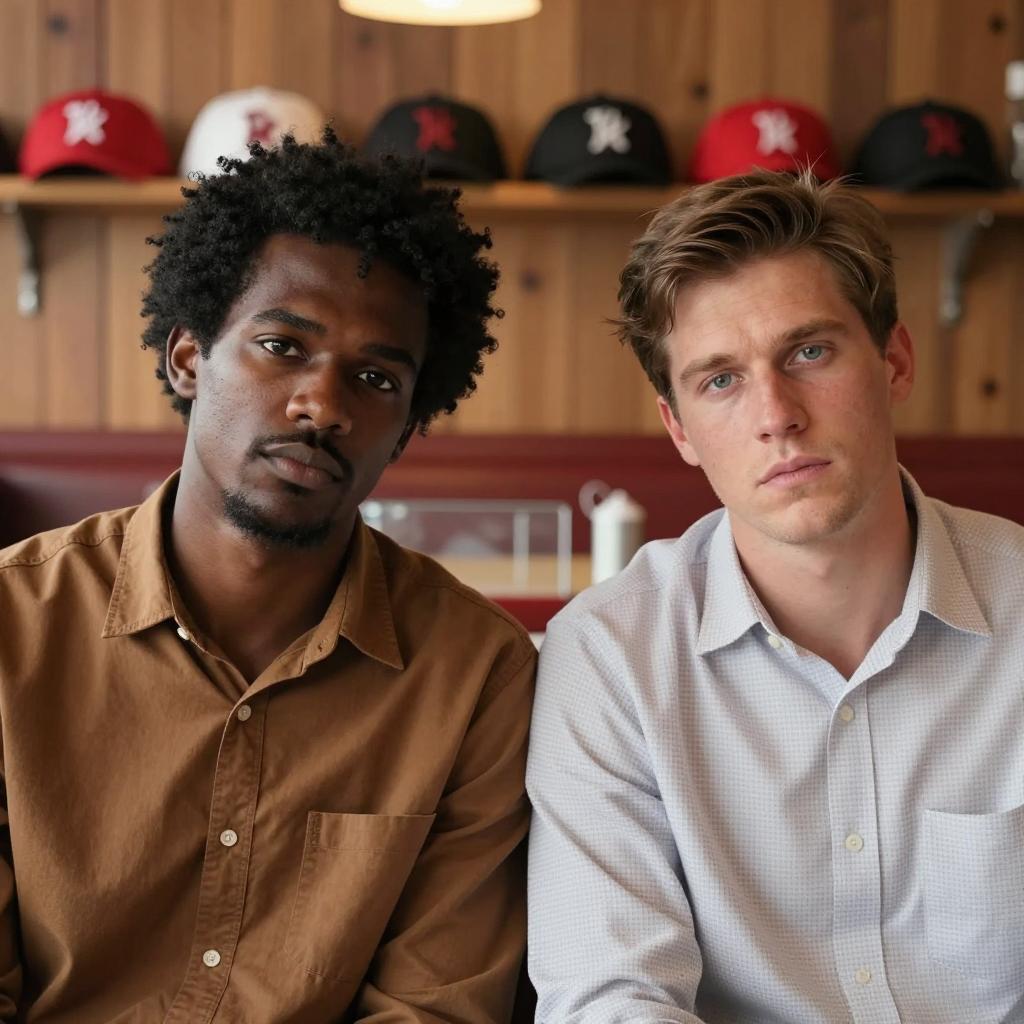 Two men sitting close together in a diner. The man on the left has dark skin, short black Afro, brown collared shirt. The man on the right has light skin, brown hair, white checkered shirt. Both have serious expressions. Background includes wooden paneling, red and black baseball caps on shelf, blurred glass counter.