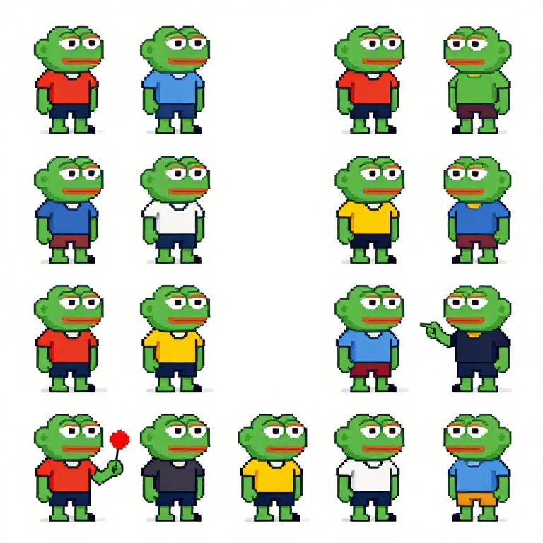 Pixel art of 16 green, cartoon-style frog characters, each wearing different colorful shirts and pants, standing in a 4x4 grid.
