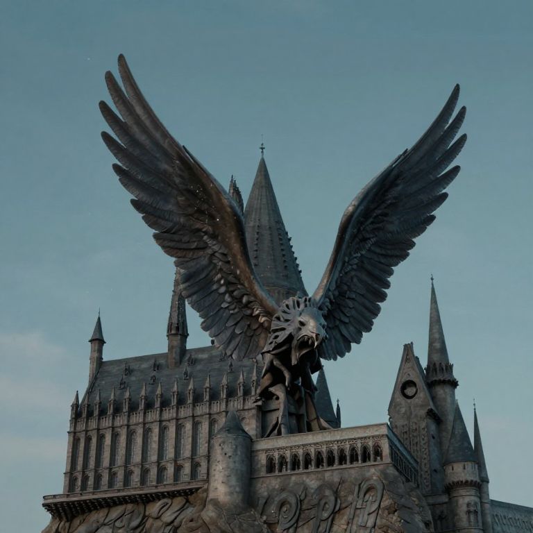 Photograph of a Gothic-style castle with intricate spires and turrets under a clear blue sky. Dominating the foreground is a large, dark bronze statue of a winged griffin, its wings spread wide, perched atop the castle. The griffin's detailed feathers and fierce expression contrast with the castle's stone texture. The castle's facade features ornate carvings and pointed arches, adding to the medieval aesthetic. The sky is bright and cloudless, enhancing the statue's shadowy presence. The image has a slightly dramatic, fantasy-like quality, reminiscent of a scene from a fairy tale or fantasy novel.