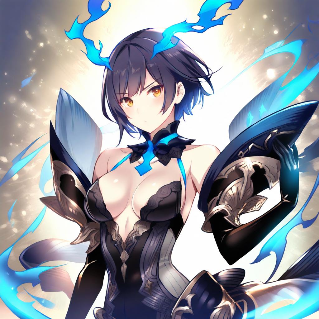 Alice (sinoalice), sinoalice, 1girl, red eyes, short hair, blue hair, dark blue hair, black hair, medium breasts, elbow gloves, by artist caffein, animagine