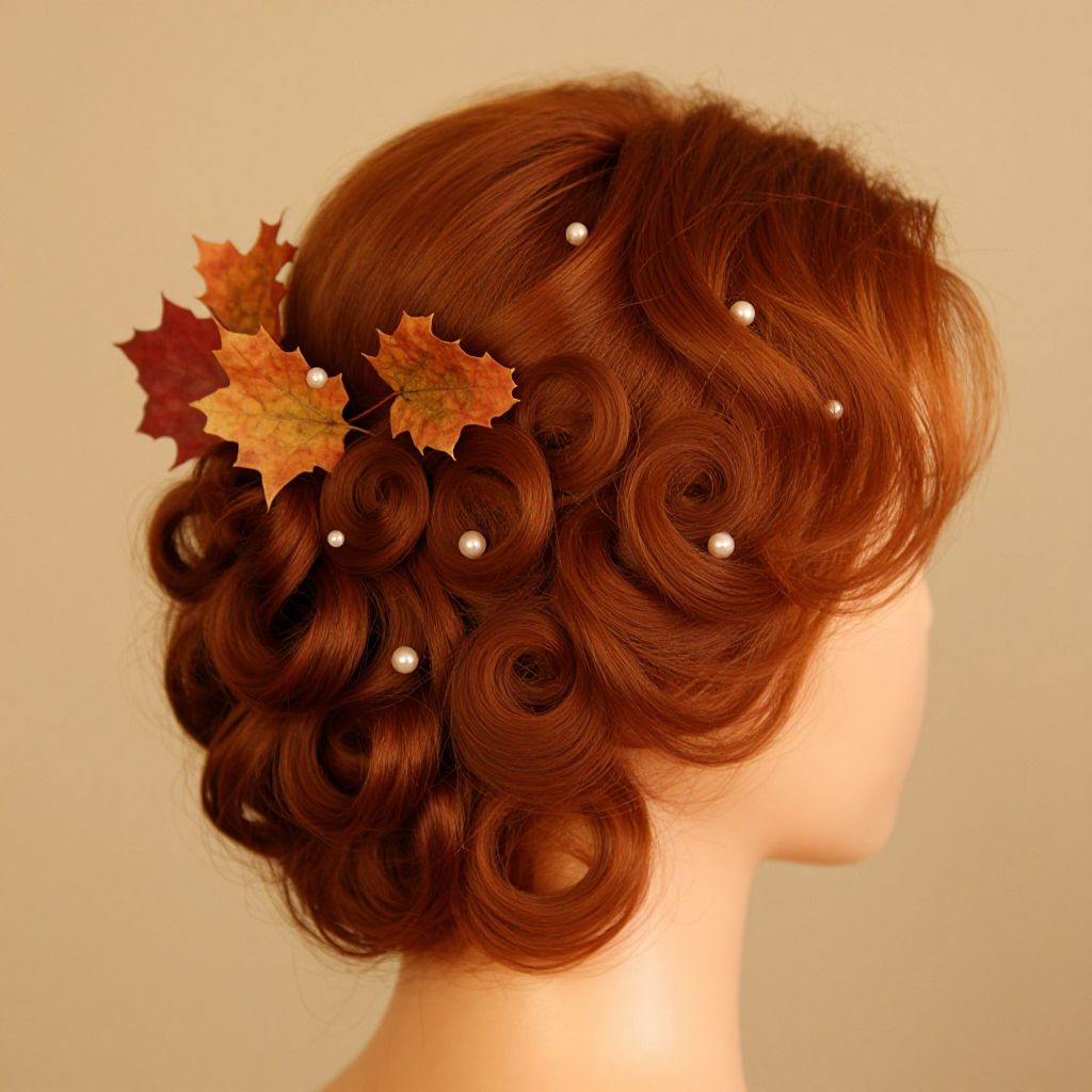 Photograph of a red-haired mannequin with a side view, featuring a vintage-style, curled updo adorned with autumn leaves and pearl hairpins