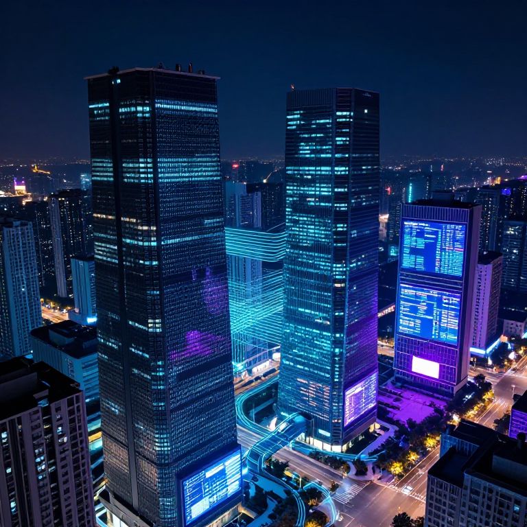 Contronet futuristic cityscape with towering data centers, pulsating light cables running between buildings, night scene illuminated by electric hues of cyan and violet, sleek architecture with digital billboards displaying network traffic, vibrant and dynamic atmosphere