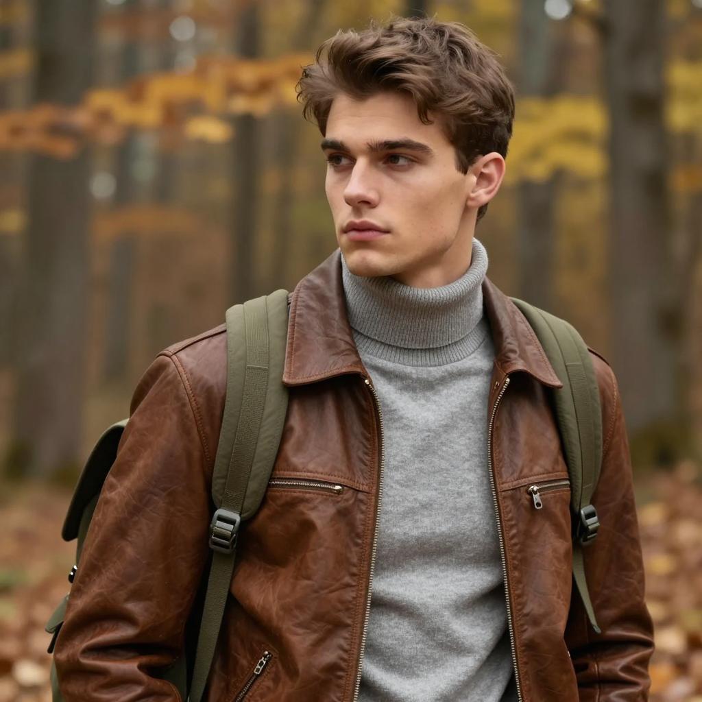 Autumn outfit male, photorealistic portrait of handsome young man, short brown hair, clean-shaven, serious expression, wearing brown leather jacket, gray ribbed turtleneck sweater, green backpack, autumn forest background, blurred trees with yellow and brown leaves, soft natural light, crisp details, realistic ures, upper body shot, masculine, fashionable, confident, attractive