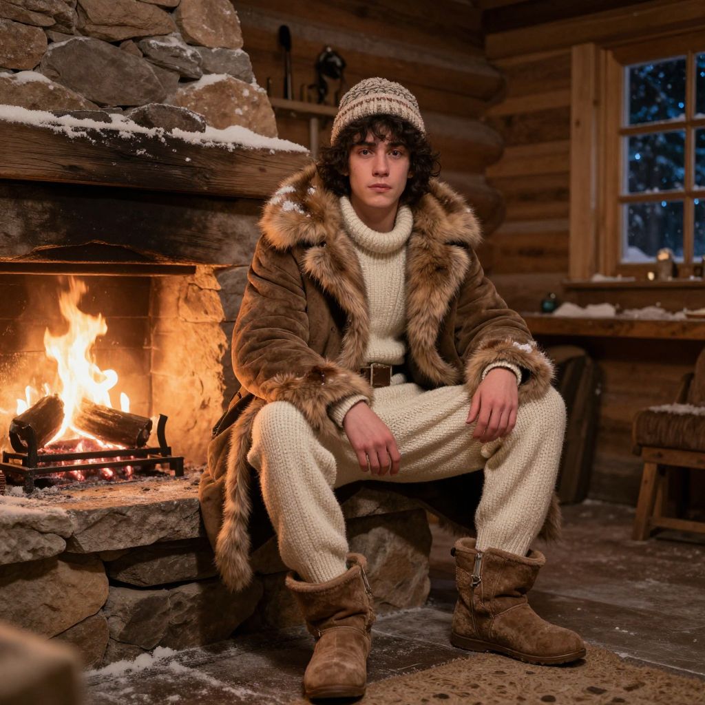 A young man with a square face and dark curly hair dressed in a full winter costume featuring a fur-lined coat, knit pants, wool boots, and a beanie, sitting by a rustic fireplace in a cozy cabin during a snowy winter evening, warm lighting, photorealistic detail