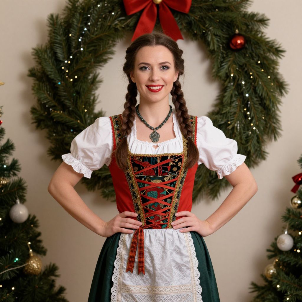 Photograph of a young Caucasian woman with fair skin and dark brown hair in two braids, standing in front of a Christmas wreath adorned with red bows and small white lights. She is wearing a traditional Bavarian dirndl with a red bodice, black and red lace-up front, white lace-trimmed puffed sleeves, and a green skirt with white lace trim. She has red lipstick and is smiling, with hands on hips. Background includes two Christmas trees with red and white ornaments. She wears a black choker with a circular pendant.