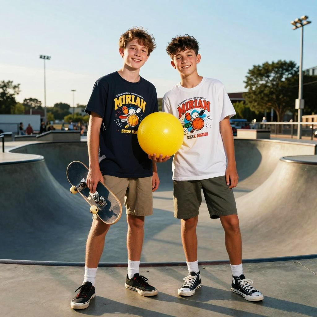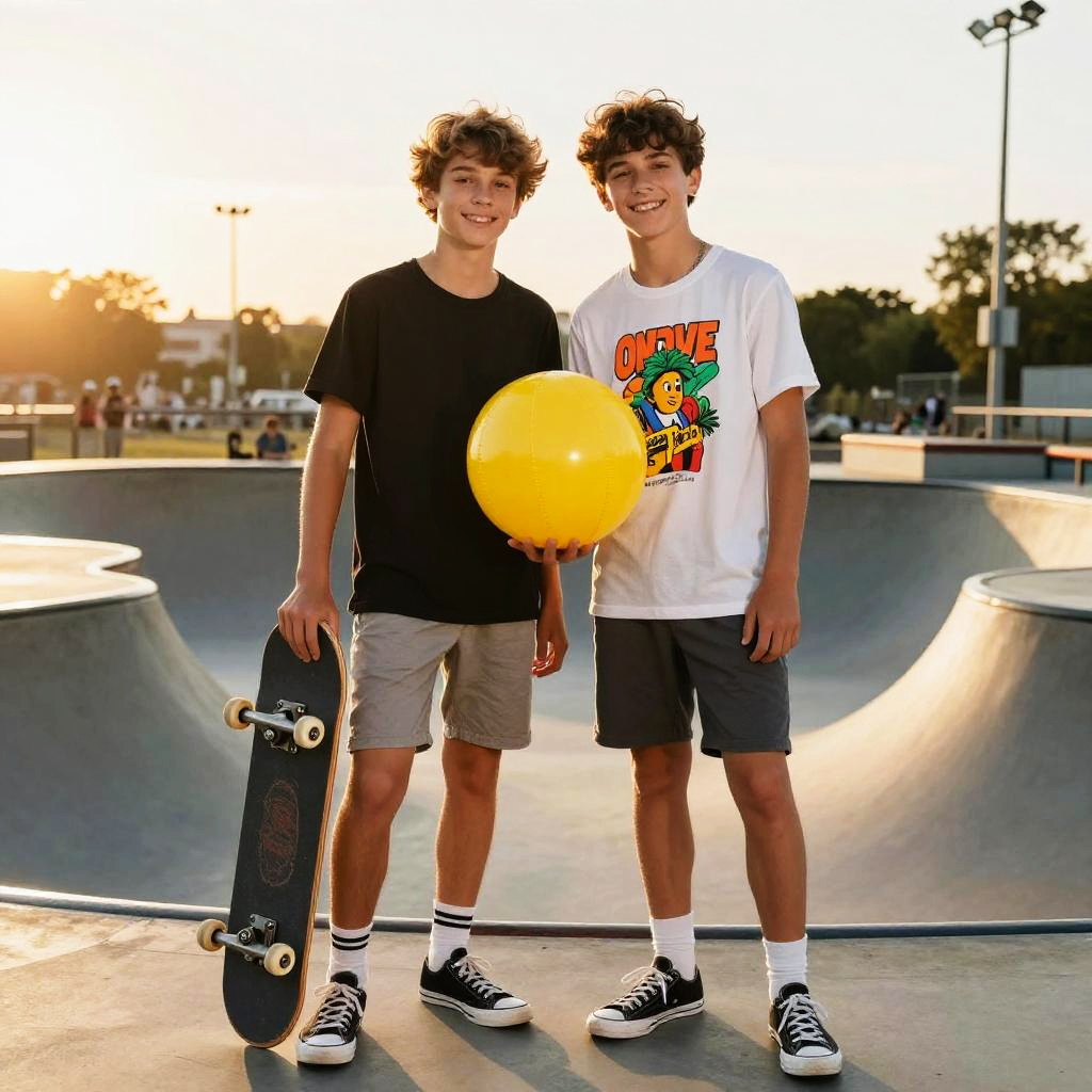 A teenage boy in a graphic tee and skateboard in hand in an urban skate park at sunset, depicted in comic book style. They pose together holding a bright yellow ball, cheerful expressions, balanced composition, vibrant yet natural palette, soft key light from the left, gentle rim light, clean background, shallow depth of field, crisp edges, subtle grain or paper texture consistent with style, controlled highlights and shadows, playful family-friendly mood, high detail and professional finish.