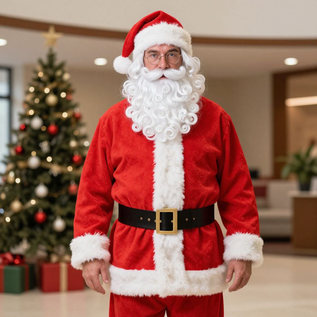 Photograph of a middle-aged, bespectacled man in a traditional Santa Claus outfit with a full white beard, standing in a brightly lit,