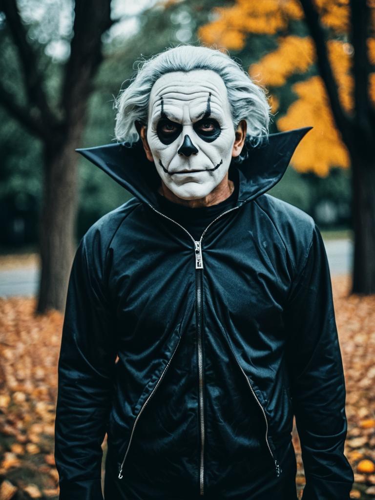 Photograph of a man with a white clown mask, green curly hair, black jacket, and Jack-o'-lantern patch, standing on a leaf
