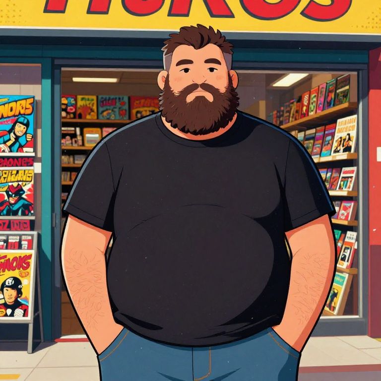 Obese neckbeard figure standing confidently in front of a comic book store, sporting a thick beard and casual clothes, a mix of modern and urban background, vibrant colors with a slight gritty texture, digital illustration.
