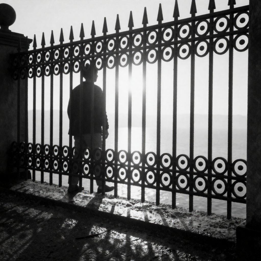 Black and white photograph of an ornate iron fence with intricate swirl patterns, standing on a dark, wet ground. Bright light shines through the gaps between the bars. Silhouetted figure partially hidden behind the fence. Number of people: 1. Intense light from behind the fence.