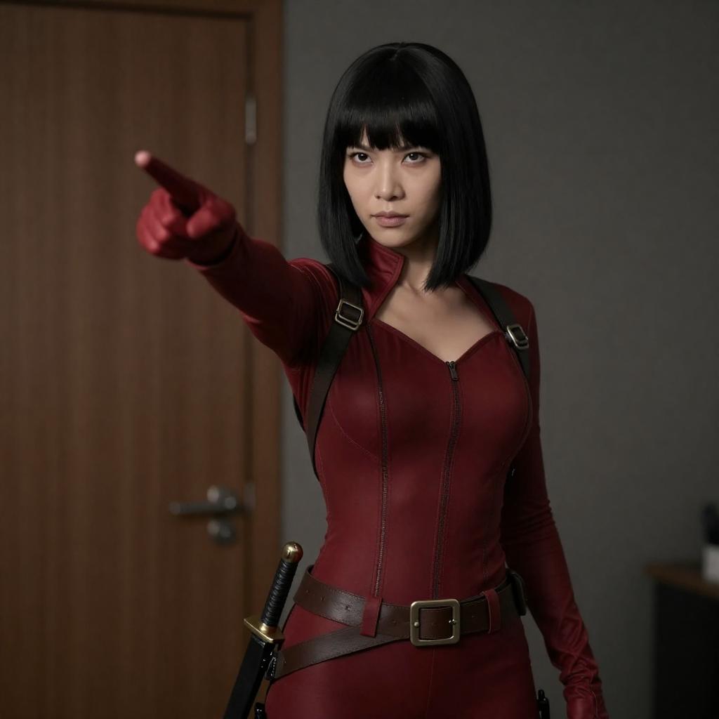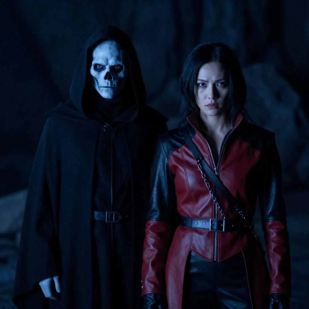 Photograph of two people in a dark, blue-lit environment. The person on the left has a pale, skeletal face, wearing a dark cloak. The person on the right has dark hair, wearing a red and black leather outfit with a chain across the chest. Both are shadowed, with intense expressions. Background features dark, rocky ures.