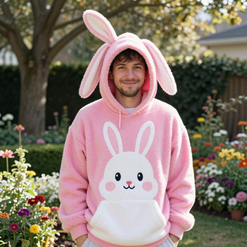 A man wearing a vibrant pink reindeer costume with large, fluffy antlers on his head, a full pink outfit that includes a pink jacket, pants, and a pink scarf, and matching pink gloves that extend to his wrists. He stands confidently in a snowy winter landscape with a soft golden sunrise behind him, exuding a joyful and festive atmosphere. The scene is bright and whimsical, capturing a playful holiday spirit with detailed textures and warm lighting.