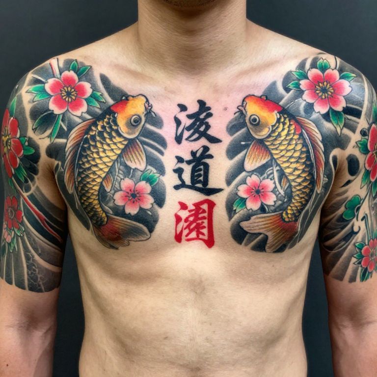 Photograph of a heavily tattooed male chest. The tattoos feature vibrant colors with detailed designs of koi fish, cherry blossoms, and Asian characters. The koi fish are gold and black, with flowing, intricate scales. Cherry blossoms are red and pink with green leaves. The Asian characters are in black and red ink, centered on the chest. The skin tone is light, and the background is blurred.