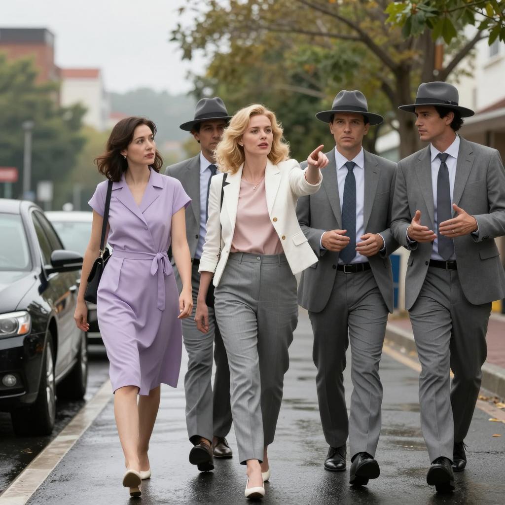 Three women wearing elaborate hats—one in leopard print, one in pink, and one white and black—sit at a round dinner table set with white plates, glassware, and a central table lamp. In the background, four classical musicians dressed in black tuxedos with large black hats play violin and cello near a grand staircase, with a dramatic fire erupting behind them. The setting is an upscale dining room with red lampshades and green plants, creating a sophisticated and intense atmosphere.