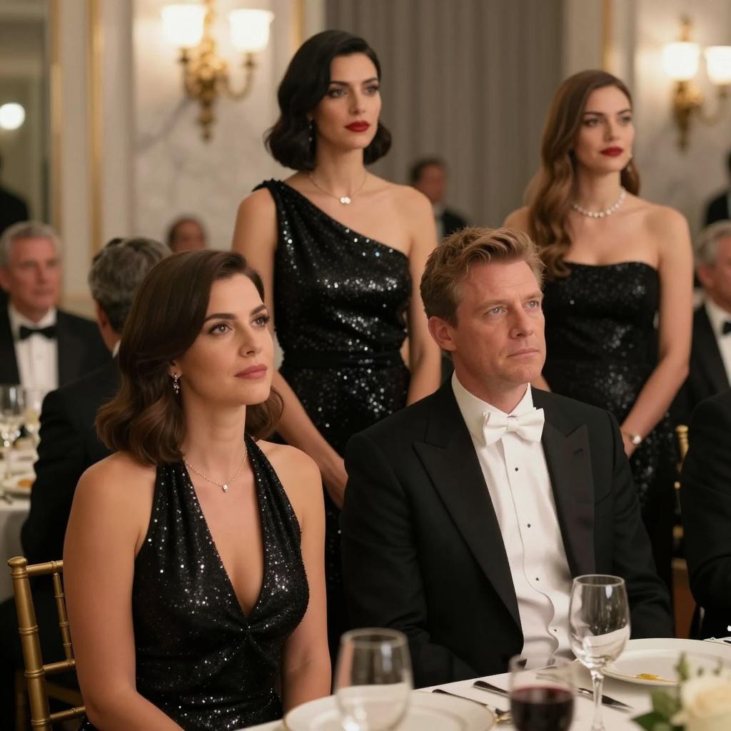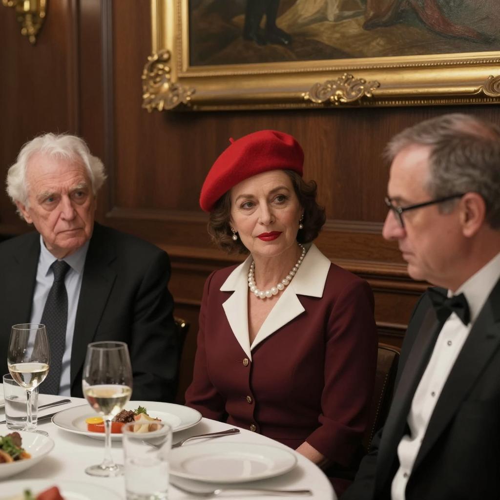 Dinner party scene. Three women in elaborate hats, one in leopard print, one in pink, and one with blonde hair, seated at a table. Background musicians on stairs playing violin and cello. Fire erupts in the background. Other diners with hats, table with lamps, plates, and glassware. Four musicians, including a man with a large hat. Red lampshades, green plants, and staircase. Intense expressions on musicians' faces. Three visible people's faces at table, one with intense gaze. Bright, dramatic lighting.