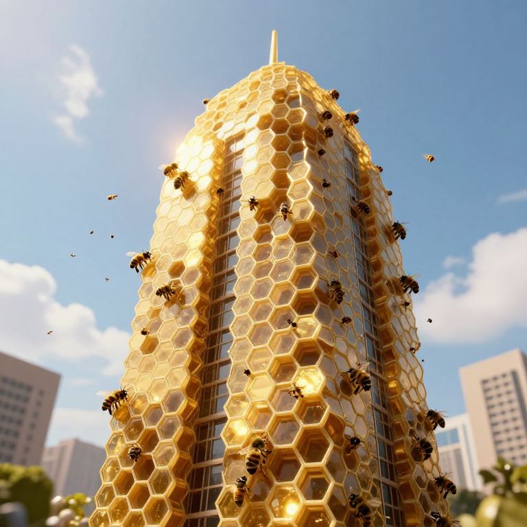 A towering honeycomb structure ascends into the sky, its golden hexagonal cells pulsating with radiant light, as bees swarm around this surreal skyscraper that defies the boundaries between nature and urban architecture.
