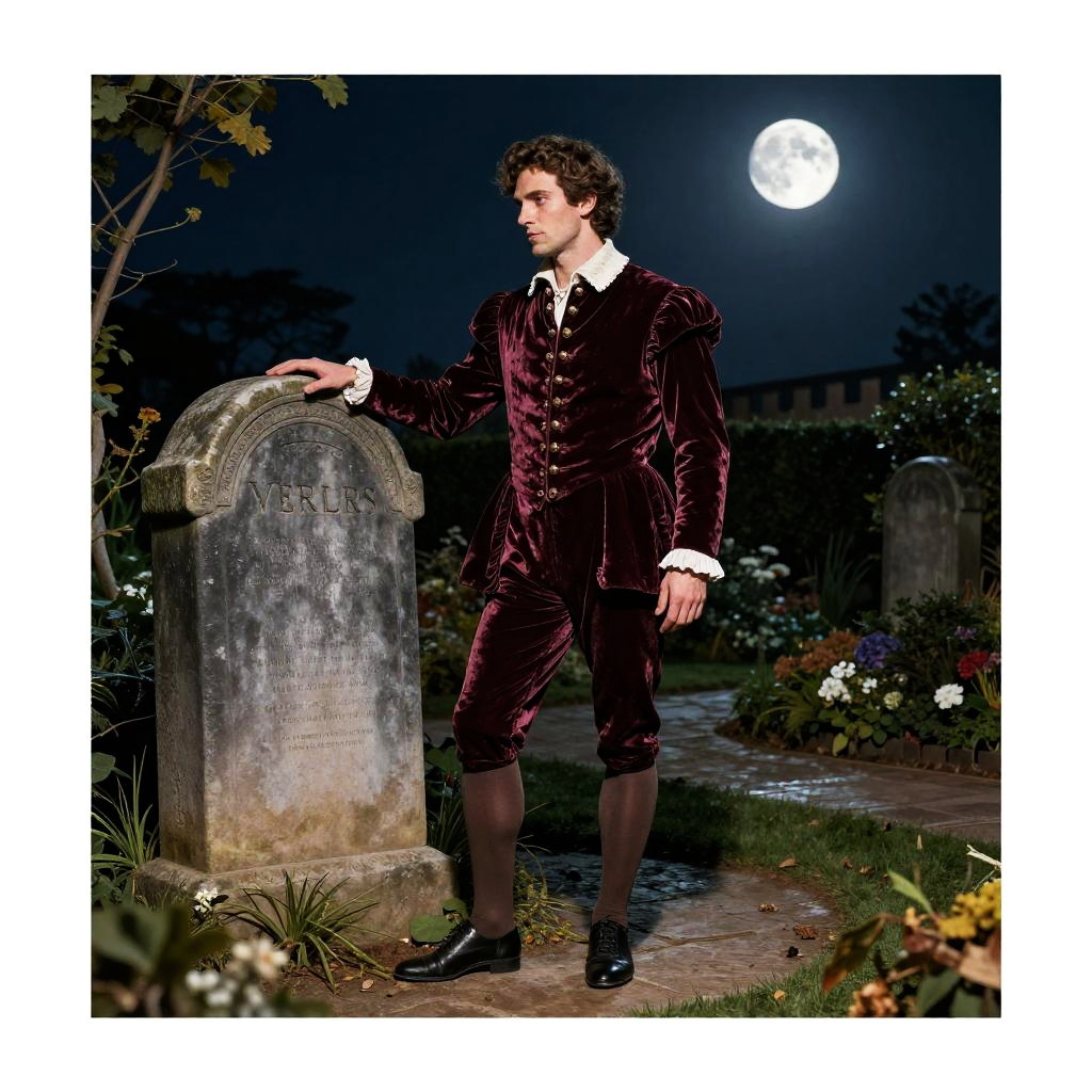 Paris role in Romeo and Juliet visualized as a respectful, noble figure in velvet doublet, standing by Verona garden tombstone, moonlit night, rich texture and historic detail