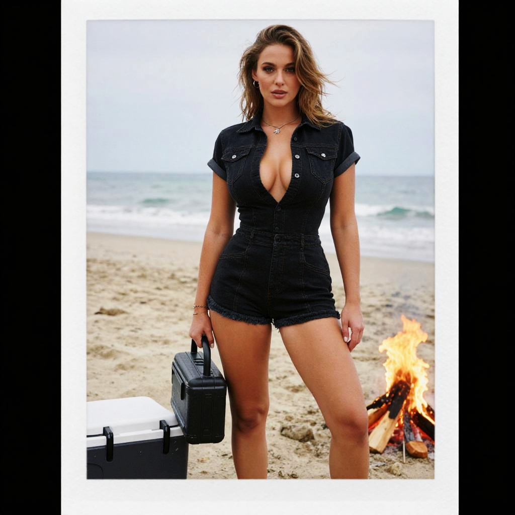 A hourglass woman in a casual chic outfit, featuring a muted gray cropped knit top and high-waisted black faux leather shorts, accessorized with oversized black sunglasses and minimalist silver rings. Visual style: Calotype process. She stands by a beach bonfire with surfboards, the warm glow of the fire illuminating her relaxed yet stylish look. Sexy. Pretty face and beаutiful eyes. Big breasts