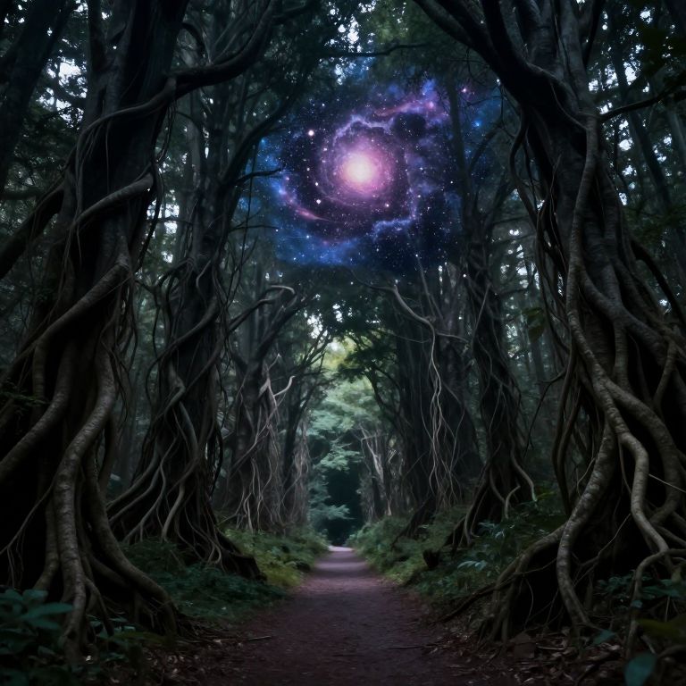 Photograph of a dense, dark forest with towering trees whose thick, twisted roots create an archway over a narrow, winding dirt path. The canopy above is dense, allowing only dark blue and green light to filter through. In the center, a glowing, purple and white circular light formation is suspended among the branches, resembling a cosmic phenomenon. The forest floor is covered in brown leaves and small green plants, adding to the mystical, almost otherworldly atmosphere. The image combines natural elements with a magical, ethereal quality.