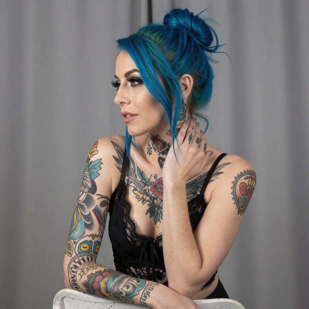 Photograph of a tattooed woman with vibrant blue hair in a messy bun, wearing a black lace top. She has colorful tattoos on her arms, chest, and neck, and is touching her neck with her left hand while looking to the side. Her right hand rests on a white patterned surface. The background is a plain gray curtain.